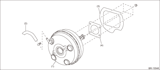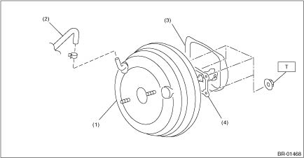 6. BRAKE BOOSTER • H4 model (1) | Vacuum booster ASSY | (3) | Gasket (model with EyeSight) | Tightening torque: N·m (kgf-m, ft-lb) | (2) | Vacuum hose | (4) | Gasket | T: | 18 (1.8, 13.3) |