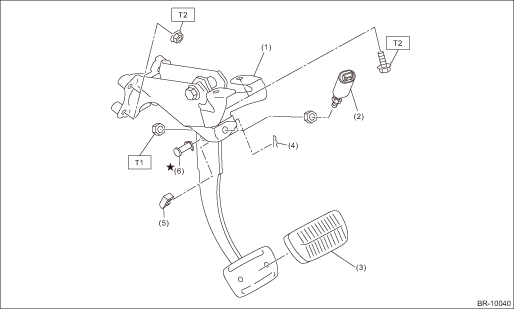 7. BRAKE PEDAL • CVT model (1) | Brake pedal ASSY | (4) | Snap pin | Tightening torque: N·m (kgf-m, ft-lb) | (2) | Stop light switch | (5) | Brake pedal stopper | T1: | 8 (0.8, 5.9) | (3) | Brake pedal pad | (6) | Clevis pin | T2: | 18 (1.8, 13.3) |