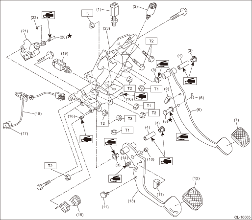 • MT model (1) | Clutch switch | (11) | Clutch pedal stopper | (20) | Clevis pin | (2) | Stop light switch | (12) | Clutch pedal pad | (21) | Master cylinder ASSY | (3) | Bushing | (13) | Clutch pedal | (22) | Clip | (4) | Spacer | (14) | Torsion spring bushing | (23) | Pedal bracket | (5) | Snap pin | (15) | Torsion spring | | | (6) | Brake pedal | (16) | Assist bushing | Tightening torque: N·m (kgf-m, ft-lb) | (7) | Brake pedal pad | (17) | Band | T1: | 8 (0.8, 5.9) | (8) | Clevis pin | (18) | Sensor harness | T2: | 18 (1.8, 13.3) | (9) | Brake pedal stopper | (19) | Clutch start switch | T3: | 30 (3.1, 22.1) | (10) | Bushing A | | | | |