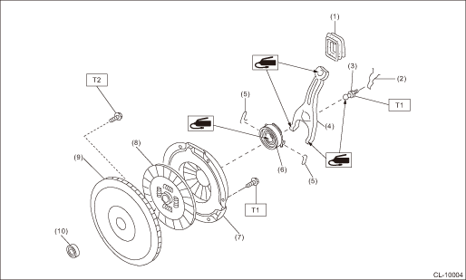1. CLUTCH ASSEMBLY (1) | Dust cover | (6) | Release bearing | Tightening torque: N·m (kgf-m, ft-lb) | (2) | Lever spring | (7) | Clutch cover | T1: | 16 (1.6, 11.8) | (3) | Pivot | (8) | Clutch disc | T2: | Flywheel > INSTALLATION | (4) | Release lever | (9) | Flexible flywheel | | | (5) | Clip | (10) | Pilot bearing | | |