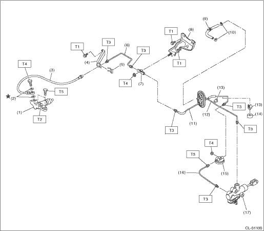 2. CLUTCH PIPE AND HOSE (1) | Operating cylinder | (9) | Tank hose | (17) | Master cylinder ASSY | (2) | Gasket | (10) | Clamp | | | (3) | Clutch hose | (11) | Clutch pipe | Tightening torque: N·m (kgf-m, ft-lb) | (4) | Clutch hose bracket | (12) | Clutch pipe | T1: | 7.5 (0.8, 5.5) | (5) | Clamp | (13) | Clamp | T2: | 7.8 (0.8, 5.8) | (6) | Clutch pipe | (14) | Mass damper | T3: | 15 (1.5, 11.1) | (7) | Connector | (15) | Clutch damper | T4: | 18 (1.8, 13.3) | (8) | Clutch bracket | (16) | Clutch pipe | T5: | 37 (3.8, 27.3) |