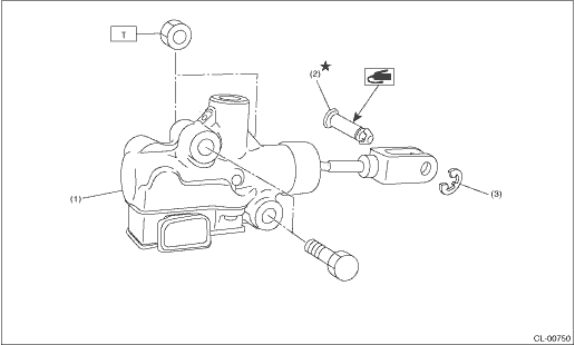 3. MASTER CYLINDER (1) | Master cylinder ASSY | (3) | Clip | Tightening torque: N·m (kgf-m, ft-lb) | (2) | Clevis pin | | | T: | 18 (1.8, 13.3) |