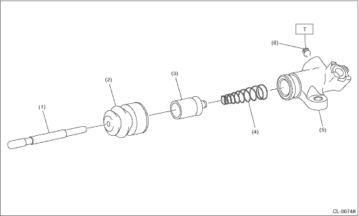 4. OPERATING CYLINDER (1) | Push rod | (4) | Piston spring | Tightening torque: N·m (kgf-m, ft-lb) | (2) | Boot | (5) | Operating cylinder | T: | 7.8 (0.8, 5.8) | (3) | Piston | (6) | Bleeder screw | | |