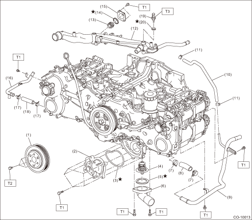 1. WATER PUMP (1) | Water pump pulley | (10) | Preheater hose | (19) | Engine coolant temperature sensor | (2) | Water pump ASSY | (11) | Clip | (20) | Gasket | (3) | Gasket | (12) | Water pipe ASSY | | | (4) | Thermostat (engine side) | (13) | Thermostat (CVTF cooler (with warmer feature) side) | Tightening torque: N·m (kgf-m, ft-lb) | (5) | Gasket (engine side) | (14) | Gasket (CVTF cooler (with warmer feature) side) | T1: | 6.4 (0.7, 4.7) | (6) | Thermostat cover (engine side) | (15) | Thermostat cover (CVTF cooler (with warmer feature) side) | T2: | 14 (1.4, 10.3) | (7) | Clip | (16) | Water pipe RH | T3: | 18 (1.8, 13.3) | (8) | Water pipe hose LH | (17) | Clip | | | (9) | Water pipe LH | (18) | Water pipe hose RH | | |