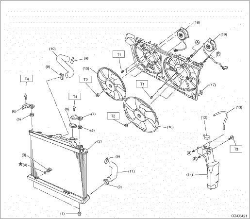 2. RADIATOR & RADIATOR FAN (1) | Radiator lower cushion | (10) | Radiator inlet hose | (19) | Radiator main fan motor | (2) | Radiator | (11) | Radiator outlet hose | | | (3) | Radiator drain plug | (12) | Engine coolant reservoir tank cap | Tightening torque: N·m (kgf-m, ft-lb) | (4) | O-ring | (13) | Over flow hose | T1: | 3.9 (0.4, 2.9) | (5) | Radiator upper cushion | (14) | Engine coolant reservoir tank | T2: | 6.4 (0.7, 4.7) | (6) | Radiator upper bracket RH | (15) | Radiator sub fan | T3: | 7.5 (0.8, 5.5) | (7) | Radiator upper bracket LH | (16) | Radiator main fan | T4: | 12 (1.2, 8.9) | (8) | Radiator cap | (17) | Radiator fan shroud | | | (9) | Clip | (18) | Radiator sub fan motor | | |