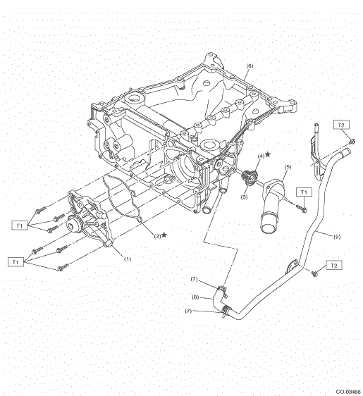 1. WATER PUMP AND WATER PIPE (1) | Water pump ASSY | (6) | Oil pan upper | Tightening torque: N·m (kgf-m, ft-lb) | (2) | Gasket | (7) | Clip | T1: | 6.4 (0.7, 4.7) | (3) | Thermostat | (8) | Hose | T2: | 16 (1.6, 11.8) | (4) | Gasket | (9) | Water return pipe | | | (5) | Thermostat cover | | | | |