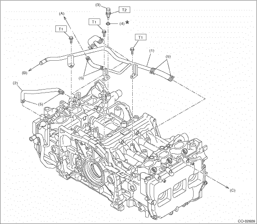 2. ENGINE COOLANT TEMPERATURE SENSOR AND HEATER HOSE (A) | To the throttle body | (B) | To heater hose | (C) | To the throttle body | | | | | | | | (1) | Heater pipe | (4) | Gasket | Tightening torque: N·m (kgf-m, ft-lb) | (2) | Preheater hose | (5) | Clip | T1: | 19 (1.9, 14.0) | (3) | Engine coolant temperature sensor | | | T2: | 22 (2.2, 16.2) |