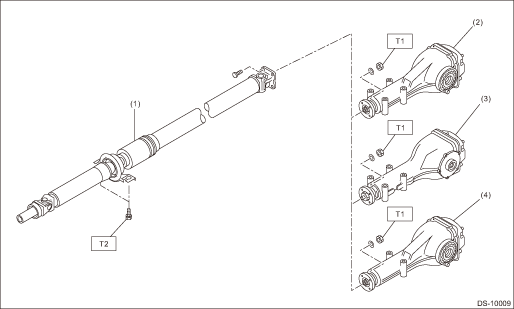 1. PROPELLER SHAFT (1) | Propeller shaft | (3) | Rear differential (T-type) | Tightening torque: N·m (kgf-m, ft-lb) | (2) | Rear differential (VA1-type) | (4) | Rear differential (VA2-type) | T1: | 31 (3.2, 22.9) | | | | | | T2: | 52 (5.3, 38.4) |
