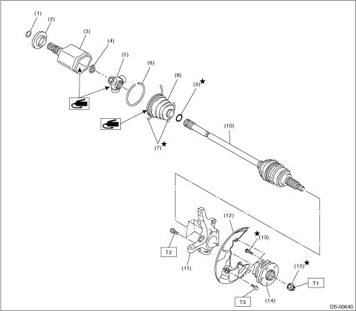 2. FRONT AXLE (1) | Circlip | (8) | Boot (PTJ) | (15) | Axle nut | (2) | Baffle plate | (9) | O-ring | | (3) | Outer race (PTJ) | (10) | EBJ shaft ASSY | Tightening torque: N·m (kgf-m, ft-lb) | (4) | Snap ring | (11) | Front axle housing | T1: | 220 (22.4, 162.3) | (5) | Trunnion | (12) | Front brake back plate | T2: | 65 (6.6, 47.9) | (6) | Snap ring | (13) | Hub bolt | T3: | 18 (1.8, 13.3) | (7) | Boot band | (14) | Front hub unit bearing | | |