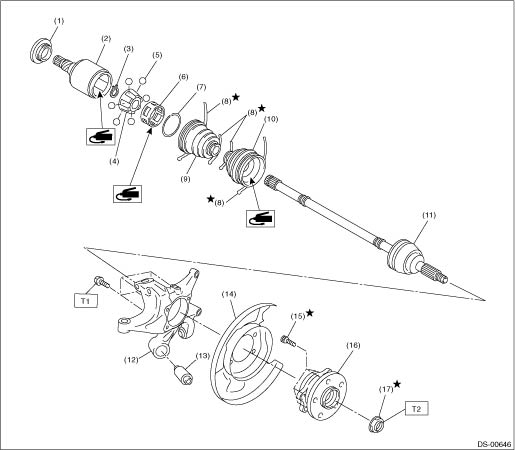 3. REAR AXLE (1) | Baffle plate | (8) | Boot band | (15) | Hub bolt | (2) | Outer race (DOJ) | (9) | Boot (DOJ) | (16) | Rear hub unit bearing | (3) | Snap ring | (10) | Boot (BJ) Boot (EBJ) | (17) | Axle nut | (4) | Inner race | (11) | BJ shaft ASSY EBJ shaft ASSY | | (5) | Ball | (12) | Axle housing | Tightening torque: N·m (kgf-m, ft-lb) | (6) | Cage | (13) | Rear bushing | T1: | 65 (6.6, 47.9) | (7) | Snap ring | (14) | Rear brake back plate | T2: | 240 (24.5, 177.0) |