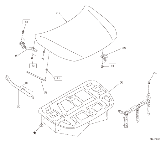 1. FRONT HOOD (1) | Hood COMPL - front | (5) | Cover - front fender UPR | Tightening torque: N·m (kgf-m, ft-lb) | (2) | Striker - front hood | (6) | Stay ASSY - front hood | T1: | 20 (2.0, 14.8) | (3) | Buffer - front hood | (7) | Stopper - front hood | T2: | 25 (2.5, 18.4) | (4) | Insulator - front hood | (8) | Hinge COMPL - front hood | T3: | 33 (3.4, 24.3) |
