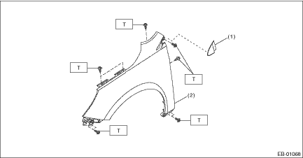 2. FRONT FENDER (1) | Cover - A pillar ASSY | (2) | Fender COMPL - front | Tightening torque: N·m (kgf-m, ft-lb) | | | | | | T: | 7.5 (0.8, 5.5) |