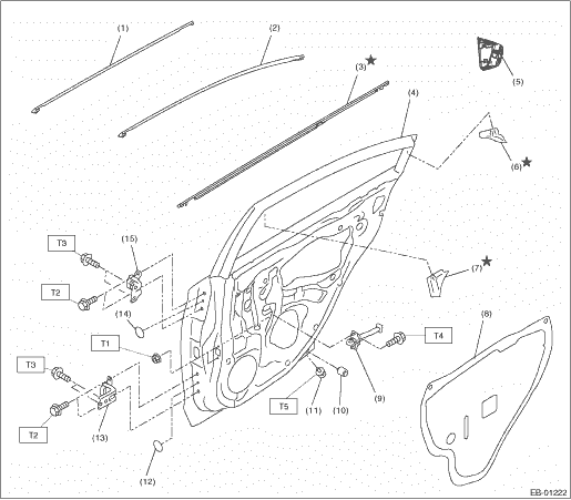 3. FRONT DOOR (1) | Molding - door sash front | (8) | Sealing cover - front door | Tightening torque: N·m (kgf-m, ft-lb) | (2) | Weather strip outer - front door | (9) | Checker ASSY - front door | T1: | 7.5 (0.8, 5.5) | (3) | Panel ASSY - front door | (10) | Grommet - lower | T2: | 25 (2.5, 18.4) | (4) | Cover B pillar - front door INN | (11) | Lower hinge - front door | T3: | 30 (3.1, 22.1) | (5) | Plate - door | (12) | Upper hinge - front door | T4: | 33 (3.4, 24.3) | (6) | Stopper - rubber | (13) | Grommet - upper | | | (7) | Front door inner pad | (14) | Cover sash - inner front | | |
