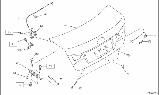 5. TRUNK LID PANEL (1) | Cable ASSY - trunk lid | (7) | Cushion - license | (13) | Striker - trunk lid | (2) | Lock ASSY - trunk lid | (8) | Stopper - trunk lid LWR | | | (3) | Clip | (9) | Stay ASSY - trunk lid | Tightening torque: N·m (kgf-m, ft-lb) | (4) | Trunk lid COMPL | (10) | Stopper - hinge | T1: | 7.5 (0.8, 5.5) | (5) | Key lock - trunk lid | (11) | Hinge ASSY - trunk lid | T2: | 25 (2.5, 18.4) | (6) | Clamp - key trunk lid | (12) | Clip | | |