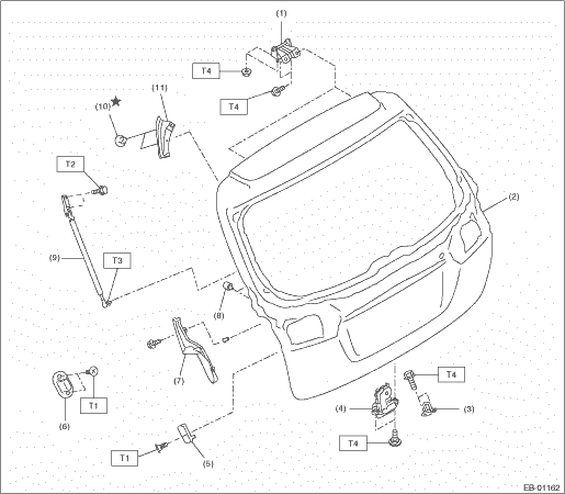 6. REAR GATE NOTE: For the components of power rear gate, refer to the power rear gate system. General Description > COMPONENT (1) | Hinge - rear gate | (7) | Cover - rear gate | Tightening torque: N·m (kgf-m, ft-lb) | (2) | Panel - rear gate | (8) | Stopper rubber | T1: | 7.5 (0.8, 5.5) | (3) | Striker - rear gate | (9) | Stay ASSY - rear gate | T2: | 16 (1.6, 11.8) | (4) | Latch & actuator - rear gate | (10) | Clip | T3: | 20 (2.0, 14.8) | (5) | Buffer - rear gate (panel - rear gate side) | (11) | Drip - rear gate | T4: | 25 (2.5, 18.4) | (6) | Buffer - rear gate (body side) | | | | |