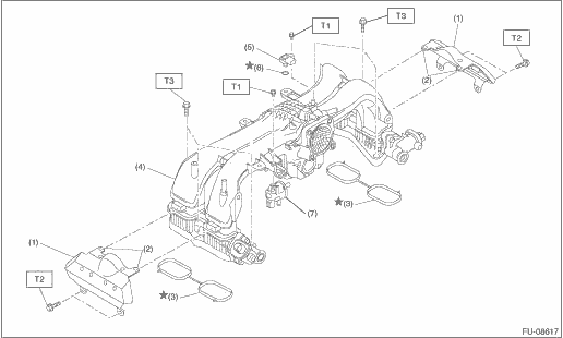 1. INTAKE MANIFOLD ASSEMBLY 1 (1) | Intake manifold protector | (5) | Manifold absolute pressure sensor | Tightening torque: N·m (kgf-m, ft-lb) | (2) | Cushion | (6) | O-ring | T1: | 3.4 (0.3, 2.5) | (3) | Gasket | (7) | Purge control solenoid valve | T2: | 6.4 (0.7, 4.7) | (4) | Intake manifold ASSY | | | T3: | 25 (2.5, 18.4) |