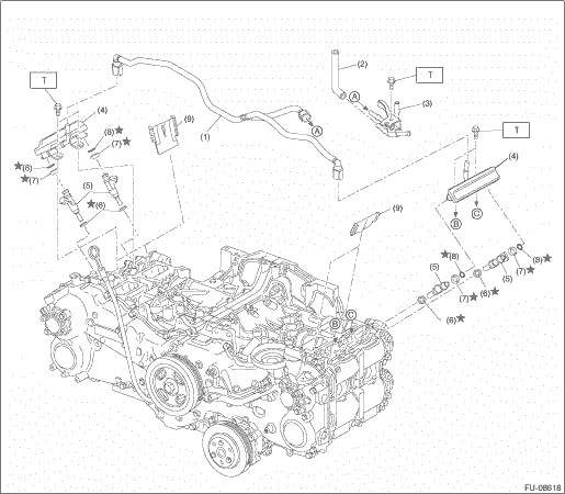 2. INTAKE MANIFOLD ASSEMBLY 2 (1) | Fuel delivery pipe | (6) | Seal ring | Tightening torque: N·m (kgf-m, ft-lb) | (2) | Vacuum hose | (7) | Rubber | T: | 6.4 (0.7, 4.7) | (3) | Fuel pipe ASSY | (8) | O-ring | | | (4) | Fuel pipe | (9) | Cylinder head plate | | | (5) | Fuel injector | | | | |