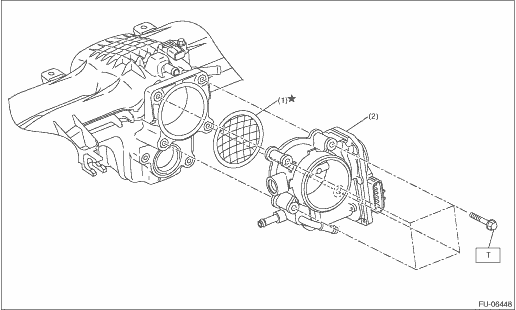 3. THROTTLE BODY (1) | Gasket | (2) | Throttle body | Tightening torque: N·m (kgf-m, ft-lb) | | | | | | T: | 8 (0.8, 5.9) |