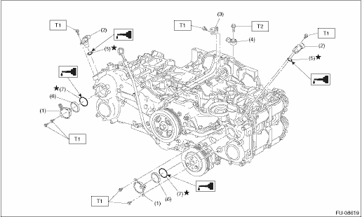 4. CRANKSHAFT POSITION, CAMSHAFT POSITION AND KNOCK SENSORS (1) | Oil control solenoid | (5) | O-ring | Tightening torque: N·m (kgf-m, ft-lb) | (2) | Camshaft position sensor | (6) | Back-up ring | T1: | 6.4 (0.7, 4.7) | (3) | Crankshaft position sensor | (7) | O-ring | T2: | 25 (2.5, 18.4) | (4) | Knock sensor | | | | |