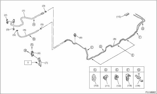 6. FUEL LINE • Fuel line 1 (1) | Fuel delivery tube | (7) | Tube clamp bracket | (13) | Pipe clamp | (2) | Tube clamp | (8) | Fuel pipe ASSY | (14) | Pipe clamp | (3) | Retainer | (9) | Fuel pipe front grommet | (15) | Fuel pipe rear grommet | (4) | Evaporation hose | (10) | Pipe clamp | | (5) | Clip | (11) | Pipe clamp | Tightening torque: N·m (kgf-m, ft-lb) | (6) | Tube clamp | (12) | Pipe clamp | T: | 7.5 (0.8, 5.5) |