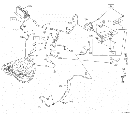 • Fuel line 2 (1) | Clip | (12) | Circulate hose | (23) | Tube clamp | (2) | Purge hose | (13) | Clip | (24) | Leak check valve ASSY | (3) | Purge pipe | (14) | Circulate tube | (25) | Drain tube | (4) | Pipe clamp | (15) | Drain filter | (26) | Canister | (5) | Clip | (16) | Drain tube | (27) | Canister protector | (6) | Air vent hose | (17) | Tube clamp | | (7) | Air vent tube | (18) | Tube clamp | Tightening torque: N·m (kgf-m, ft-lb) | (8) | Clamp | (19) | Tube clamp | T1: | 2 (0.2, 1.5) | (9) | Fuel filler hose | (20) | Drain tube | T2: | 2.5 (0.3, 1.8) | (10) | Clamp | (21) | Purge tube | T3: | 7.5 (0.8, 5.5) | (11) | Clip | (22) | Vent tube | T4: | 8 (0.8, 5.9) |