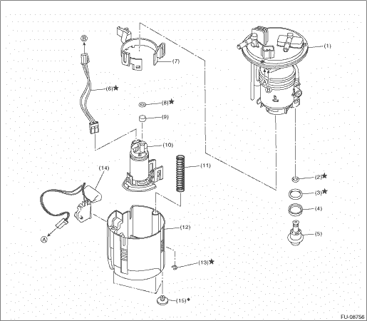8. FUEL PUMP (1) | Fuel filter ASSY | (6) | Connector cable | (11) | Spring | (2) | O-ring | (7) | Fuel pump holder | (12) | Fuel chamber ASSY | (3) | O-ring | (8) | O-ring | (13) | Clip | (4) | Back-up ring | (9) | Spacer | (14) | Fuel level sensor | (5) | Pressure regulator | (10) | Fuel pump | (15) | Cushion | * When removing the cushion from the fuel chamber assembly, replace it with a new part. |