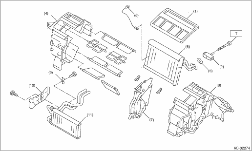 1. HEATER COOLING UNIT (1) | Packing - heater unit | (6) | Thermostat - cooling | (11) | Heater core | (2) | Expansion valve - cooling | (7) | Plate | | | (3) | Packing | (8) | Case - heater unit RH | Tightening torque: N·m (kgf-m, ft-lb) | (4) | Case - heater unit LH | (9) | Clamp | T: | 3.5 (0.4, 2.6) | (5) | Evaporator ASSY - cooling | (10) | Cover | | |