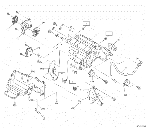 (1) | Motor - actuator mode | (8) | Aspirator | (15) | Hose - heater drain | (2) | Cover - actuator | (9) | Aspirator hose | | | (3) | Link plate | (10) | Motor ASSY - rear heater | Tightening torque: N·m (kgf-m, ft-lb) | (4) | Motor - actuator mix LH | (11) | Duct - foot assist | T: | 7.5 (0.8, 5.5) | (5) | Heater cooling unit | (12) | Packing | | | (6) | Packing | (13) | Duct - foot driver | | | (7) | Motor - actuator mix RH | (14) | Case - heater lower | | |