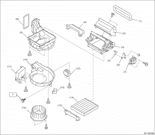 2. BLOWER MOTOR UNIT (1) | Packing | (8) | Packing - blower | (14) | Filter | (2) | Air duct cover UPR | (9) | Case upper - blower | (15) | Filter cover | (3) | Air duct cover LWR | (10) | Case lower - blower | (16) | Blower motor ASSY | (4) | Shutter - heater | (11) | Control module | | | (5) | Lever | (12) | Power transistor (auto A/C model) or resistor (manual A/C model) | Tightening torque: N·m (kgf-m, ft-lb) | (6) | Link plate | (13) | Blower motor relay | T: | 7.5 (0.8, 5.5) | (7) | Intake door actuator | | | | |