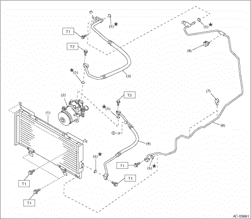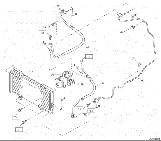 • H6 model (1) | Condenser ASSY - air conditioner | (5) | Seal O-ring | Tightening torque: N·m (kgf-m, ft-lb) | (2) | Compressor ASSY | (6) | Pipe - evaporator cooling | T1: | 7.5 (0.8, 5.5) | (3) | Hose - pressure suction | (7) | Clip - pipe | T2: | 10 (1, 7.4) | (4) | Hose - pressure discharge | (8) | Clip | | |