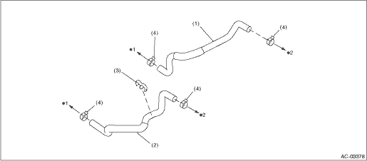 5. HEATER HOSE (1) | Hose - heater outlet | (3) | Clip | (4) | Clamp | (2) | Hose - heater inlet | | | | | *1: Engine side *2: Heater core side |