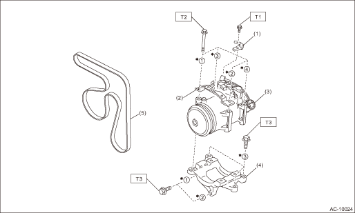 6. COMPRESSOR • H4 model (1) | Bracket - connector | (4) | Bracket - air conditioner | Tightening torque: N·m (kgf-m, ft-lb) | (2) | Bracket - V-belt cover | (5) | V-belt (6 PK) | T1: | 6.4 (0.7, 4.7) | (3) | Compressor ASSY | | | T2: | 25 (2.5, 18.4) | | | | | | T3: | 36 (3.7, 26.6) | * Tighten the compressor assembly and the bracket - air conditioner in the numerical order as shown in the figure. |