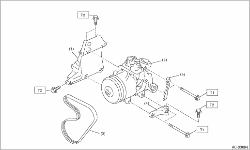 • H6 model (1) | Bracket ASSY - compressor | (4) | Bracket - air conditioner | Tightening torque: N·m (kgf-m, ft-lb) | (2) | Compressor ASSY | (5) | Bracket - connector | T1: | 26.5 (2.7, 19.5) | (3) | V-belt (6 PK) | | | T2: | 36 (3.7, 26.6) |