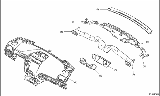 7. HEATER DUCT (1) | Duct - side ventilation LH | (4) | Nozzle - front defroster | (7) | Duct - center vent | (2) | Duct - side defroster LH | (5) | Duct - side defroster RH | (8) | Duct - center vent front | (3) | Grille - front defroster | (6) | Duct - side ventilation RH | (9) | Panel COMPL - instrument |