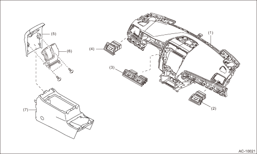 8. AIR VENT GRILLE (1) | Panel COMPL - instrument | (4) | Grille ASSY - ventilation LH | (6) | Grille ASSY - rear heater | (2) | Grille ASSY - ventilation RH | (5) | End cover - console box | (7) | Console box outer | (3) | Grille ASSY - CTR ventilation | | | | |