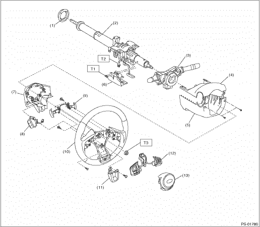 1. STEERING WHEEL AND COLUMN (1) | Bushing | (7) | Cover - steering wheel LWR | (13) | Airbag module | (2) | Column ASSY - steering | (8) | MID switch (multi-information display) | | | (3) | Switch ASSY - combination | (9) | Paddle shift | Tightening torque: N·m (kgf-m, ft-lb) | (4) | Cover ASSY - column UPR | (10) | Steering wheel | T1: | 4 (0.4, 3.0) | (5) | Cover ASSY - column LWR | (11) | Cover - spoke | T2: | 20 (2.0, 14.8) | (6) | Knee protector | (12) | Satellite switch | T3: | 39 (4.0, 28.8) |