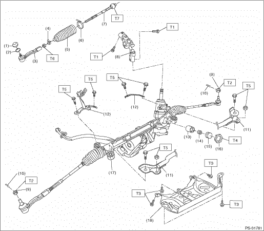 2. STEERING GEARBOX (1) | Dust seal | (10) | Cotter pin | Tightening torque: N·m (kgf-m, ft-lb) | (2) | Clip - boot tie-rod end | (11) | Crossmember support - front | T1: | 24 (2.4, 17.7) | (3) | Tie-rod end | (12) | Stiffener | T2: | 27 (2.8, 19.9) | (4) | Clip - boot tie-rod | (13) | Sleeve | T3: | 30 (3.1, 22.1) | (5) | Boot - steering gearbox | (14) | Spring - gearbox | T4: | 45 (4.6, 33.2) | (6) | Band - boot | (15) | Adjusting screw | T5: | 60 (6.1, 44.3) | (7) | Tie-rod | (16) | Lock nut | T6: | 85 (8.7, 62.7) | (8) | Universal joint ASSY - steering | (17) | Steering gearbox ASSY | T7: | 90 (9.2, 66.4) | (9) | Castle nut | (18) | Guard | | |