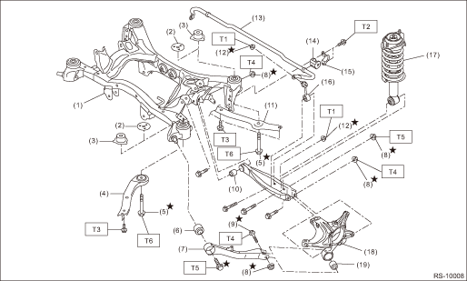 1. REAR SUSPENSION (1) | Rear sub frame ASSY | (11) | Support - sub frame | Tightening torque: N·m (kgf-m, ft-lb) | (2) | Rear sub frame stopper upper (sedan model) | (12) | Flange nut | T1: | 33 (3.4, 24.3) | (3) | Rear sub frame stopper upper (OUTBACK model) | (13) | Rear stabilizer | T2: | 38 (3.9 28.0) | (4) | Front sub frame support plate | (14) | Bushing - stabilizer | T3: | 70 (7.1, 51.6) | (5) | Flange bolt A | (15) | Clamp - stabilizer bushing | T4: | 80 (8.2, 59.0) | (6) | Bushing A - trailing link | (16) | Stabilizer link ASSY | T5: | 120 (12.2, 88.5) | (7) | Trailing link | (17) | Rear shock absorber ASSY | T6: | 145 (14.8, 106.9) | (8) | Self-locking nut | (18) | Housing ASSY - rear axle | | | (9) | Flange bolt B | (19) | Bushing - trailing link | | | (10) | Bushing C - lateral link rear | | | | |