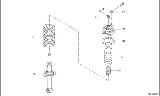 2. REAR SHOCK ABSORBER (1) | Flange nut | (5) | Dust cover - rear shock | Tightening torque: N·m (kgf-m, ft-lb) | (2) | Self-locking nut | (6) | Helper - rear | T1: | 25 (2.5, 18.4) | (3) | Shock mount - rear | (7) | Coil spring - rear | T2: | 30 (3.1, 22.1) | (4) | Rubber seat - shock UPR | (8) | Shock absorber COMPL - rear | | |