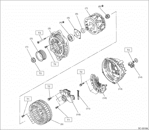2. GENERATOR (1) | Pulley nut | (8) | Bearing | Tightening torque: N·m (kgf-m, ft-lb) | (2) | Pulley | (9) | Stator coil | T1: | 2 (0.2, 1.5) | (3) | Front cover | (10) | IC regulator | T2: | 3.9 (0.4, 2.9) | (4) | Ball bearing | (11) | Brush | T3: | 4.4 (0.4, 3.2) | (5) | Bearing retainer | (12) | Rectifier | T4: | 8.9 (0.9, 6.6) | (6) | Spacer | (13) | Rear cover | T5: | 117.5 (12.0, 86.7) | (7) | Rotor | (14) | Terminal B | | |