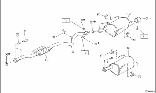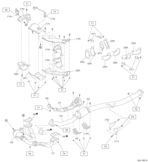 (6) | Gasket | (20) | Front exhaust pipe lower cover B | T1: | 13 (1.3, 9.6) |