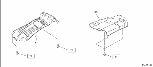 (11) | Hanger bracket (CVT model) | (25) | Front exhaust pipe side cover C | T6: | 42.5 (4.3, 31.3) |