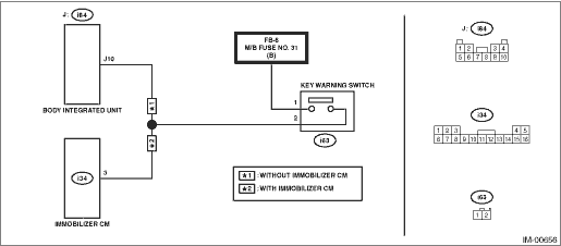 6.CHECK IGNITION SWITCH CIRCUIT. 1) Disconnect the connector from immobilizer CM. 2) Measure the resistance between immobilizer CM connector terminal and fuse. Connector & terminal (i34) No. 2 — F/B fuse No. 3 (lower stream side): | Is the resistance less than 10 -- | Replace the immobilizer CM. Immobilizer Control Module | Replace the open circuit of harness between the immobilizer CM and fuse. |