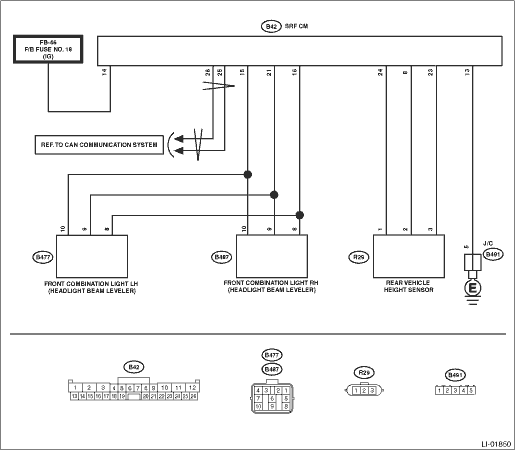 8.CHECK OUTPUT VOLTAGE BETWEEN HEADLIGHT ASSEMBLY (ACTUATOR). 1) Disconnect the SRF CM connector. 2) Turn the ignition switch to ON. 3) Measure the voltage between SRF CM connector and chassis ground. Connector & terminal (B42) No. 16 (+) — Chassis ground (−): | | Replace the headlight assembly. Headlight Assembly | Diagnostics with Phenomenon > INSPECTION |