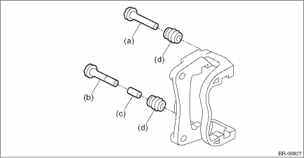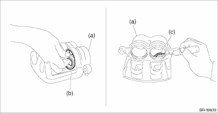 3. Remove the piston boot (b) and piston seal (c) from the caliper body cylinder (a). CAUTION: Do not damage the cylinder and piston seal groove.