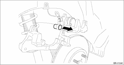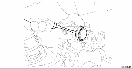 CAUTION: • The piston cannot be removed from the caliper body assembly. • Do not remove the parking brake actuator assembly except when there are system malfunctions (such as emergency release of parking brake or abnormal actuator) or when the caliper is replaced. When the parking brake actuator assembly is reused, always replace the O-ring with a new part contained in the caliper body assembly. 1. Remove mud and foreign matter from the caliper body assembly. 2. Remove the piston boot.