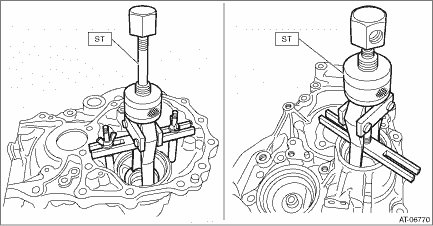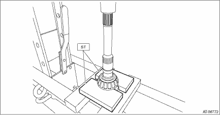 8. Remove the inner race and drive pinion shim from drive pinion shaft using ST.
