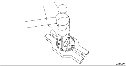 5. Remove the ball bearing, while tapping the entire circumference around the ball bearing outer race a little at a time through the front reduction driven shaft hole using the round bar with diameter of 7 mm (0.28 in).