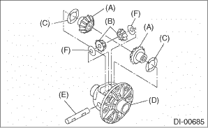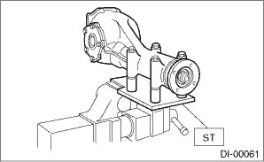 To detect the real cause of trouble, inspect the following items before disassembling. • Tooth contact and backlash between hypoid driven gear and drive pinion • Hypoid driven gear runout on its back surface • Total preload of drive pinion 1. Set the ST on vise and install the differential assembly to ST.