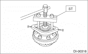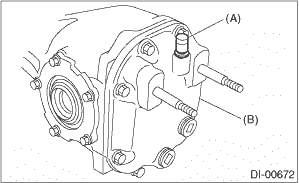 4. Remove the bolts, and then remove the rear cover. 5. Remove the stud bolts from rear cover if necessary. 6. Remove the side retainer attachment bolts, set the ST to differential case, and extract the side retainers RH and LH with a puller. NOTE: • Side retainer shim of each side should be kept together with its mating retainer. • Keep the side retainers separate by attaching tags or in similar ways to make it possible to identify RH and LH sides during reassembly.